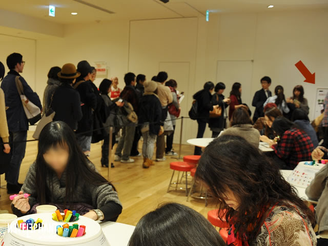 ▲ 長長排隊等後座位的人潮依舊,確認有座位後得要在旁邊的機器(紅色箭頭處)購買空杯,然後依員工指示入座。