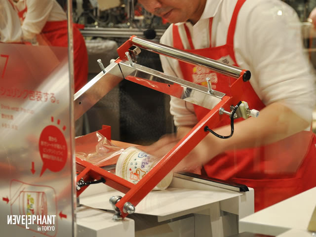 有時候不得不佩服日本人的用心,一個製作泡麵的流程,就很簡單很好玩的讓大家搞懂,重點是過程的環境跟最後這個精心設計的空氣防震袋,背在頸子上,輕鬆攜帶,走在路上還頗引人注目的,同時還有宣傳效果,真是一舉好多得。